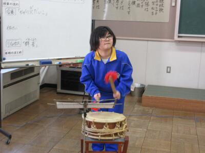 1月28日(水)音楽の授業で、かがり火たいこを行いました。鵜飼を題材にしたもので、赤い紙花を付けたばちをかがり火に見立てて演奏しました。ばちを上から下に振り下ろす力強いばちさばきと振り付けによって、軽やかなリズムにのった迫力のある太鼓の音が教室いっぱいに響き渡りました。