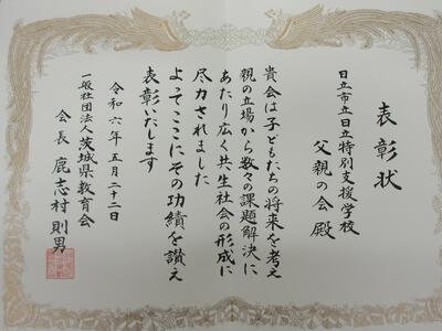 5月22日(水)ホテルレイクビュー水戸に於いて、令和6年度一般社団法人茨城県教育会定時総会が行われ、本校「父親の会」が教育功労者として表彰されました。