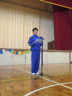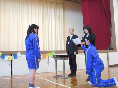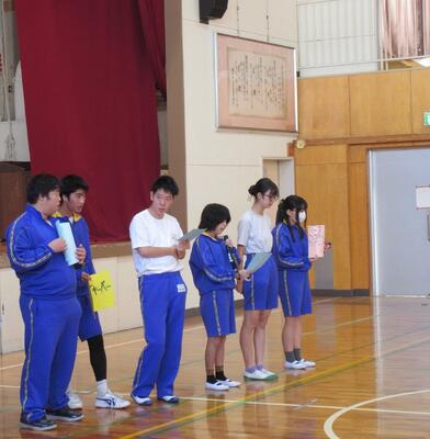 スローガン「みんなで力を合わせて全力で楽しむ!」を考えた中学部3年2組と、素敵なポスターを描いた高等部生徒の表彰がありました。