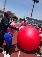 開会式後のレクリエーションでは、大玉転がしを笑顔で楽しみました。