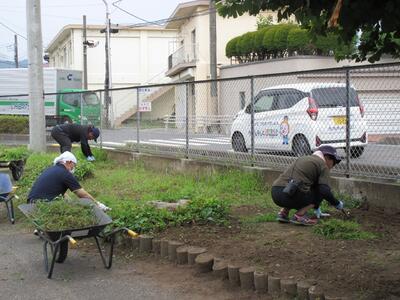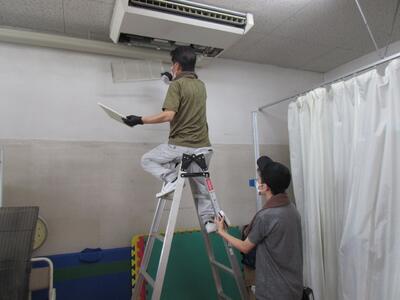 とても暑い中でしたが、保護者の皆様と教職員全42名の参加により、今年度もエアコンフィルター掃除と除草作業の2班に分かれ作業を行いました。