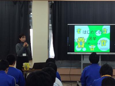 高等部 選挙出前講座 投稿: 作成者 (01/09) カテゴリー: 今日の出来事 新学期が始まりました。1月9日(金)社会科の学習として、選挙管理委員会の方を招いて、選挙についての出前講座を行いました。「選挙」とは何か、選挙の四原則は何か、投票率の現状と問題点は何かなどについて学習しました。若い人が投票に行くことで、若い人の考えが反映されるという話を聞いた後、演習として3人の演説VTRを聞き、自分だったらどの人に投票するかを考えました。 今日の話を聞き、選挙について理解することができた、という感想がありました。 Tweet -